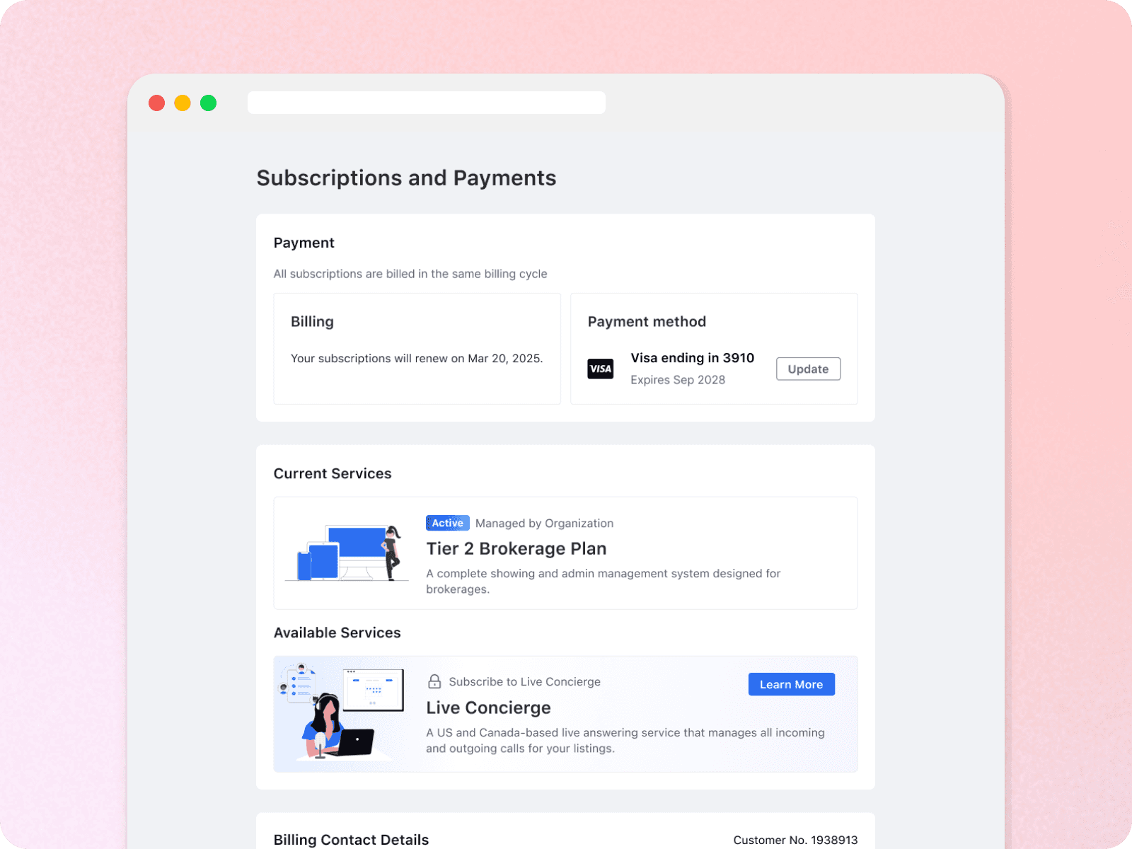 Consolidating multiple subscription services into a centralized location so that agents can subscribe, manage, and update their payment & services.
